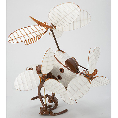 風見鶏に興味があり、風を力に変える仕組みを利用した自分なりの作品をつくりました。風でプロペラを回し、その動力を複数の歯車に伝えることで動きます。正面のプロペラに風を当てると歩行し、また左右のプロペラに風を当てると、その方向に向きを変えます。ボディは軽量化と空気の流れを考慮し、曲げた角棒に和紙を貼り曲面をつくりました。