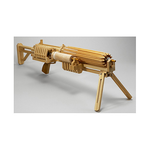 「数百連発の輪ゴム鉄砲をつくってみたい」というかねてからの願望を実現すべく、輪ゴムを504発連射できる木製マシンガンを製作しました。ミシンのボビン(糸巻き)が回転するようすをヒントに、大量の輪ゴムの実装と高速連射の仕組みを考案しました。1秒間に15発のサイクルで連射することができます。