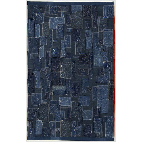 骨董店で刺し子と出会い、子どもの頃、母が針仕事をしていた姿を思い出して、10年ほど前から趣味として始めました。藍染めの古布を基布としましたが、破れや色焼け、シミ跡をカバーするために、異なった色合いの端切れを当て布として利用し、白糸で縫い付け、段染糸で刺しました。