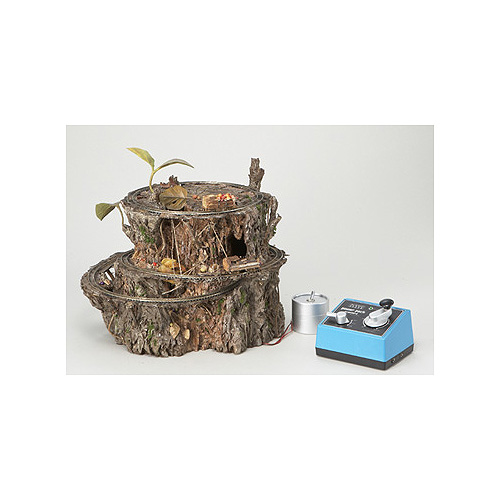 本物の切り株をリアルに再現し、そこに2コースの鉄道を設け、木の実を運ぶ機関車が走行します。森の妖精か不思議な動物が走らせているのか、そんな想像も楽しめます。鉄道模型ではなく、あくまでも原寸大イメージの小さくて不思議な夢の鉄道という設定です。