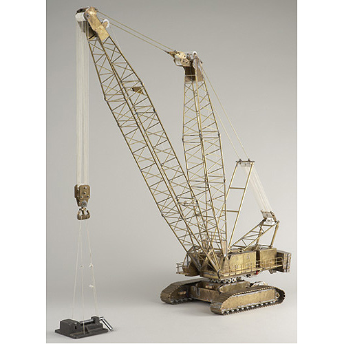 子どもの頃からクレーンが好きで、実物に近いものをつくりたいと思っていました。これは土木建設用の大型クレーンの1/60サイズです。実際にものを吊り上げるほか、上部は旋回し、走行もします。塗装はせず、素材の真鍮(黄銅)を強調しました。