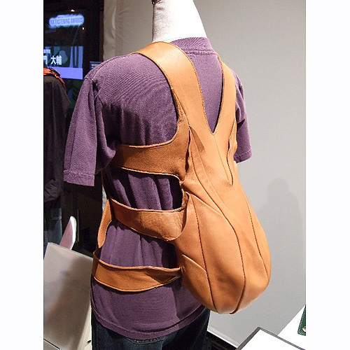 “パーメックス”をタコの吸盤に見立て、その留め方を変えることで様々なスタイルで体に絡みつかせることのできるバッグです。