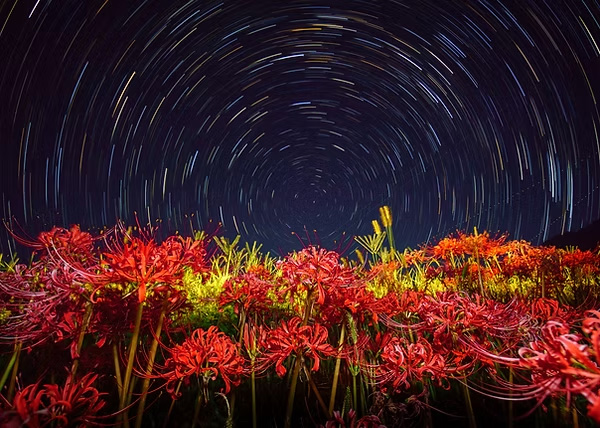 - 手前に彼岸花。北極星を中心とした長時間撮影。