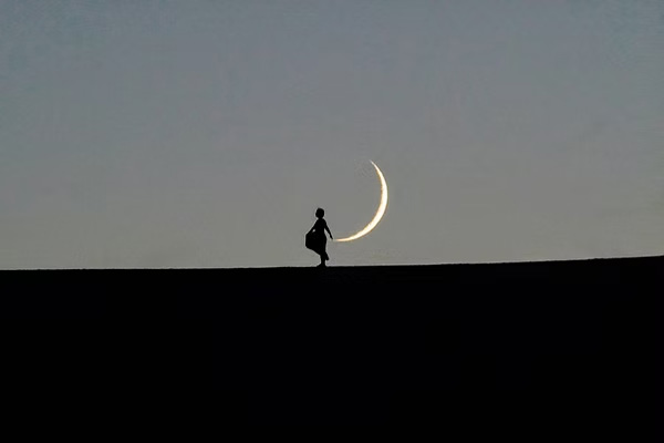 - かなり遠くから撮影しないと、人と月の大きさがここまでにはならない。