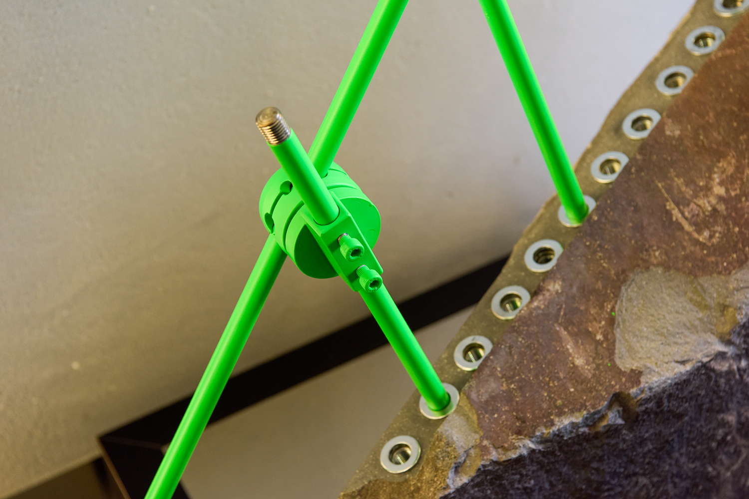 さらに、通常はカメラの照明器具などに使われるステンレスパイプとアルミ製のジョイント部分を、緑色の蛍光塗料で塗装し、石と調和する「緑」の色合いに微妙な不自然さを残した。「建築やプロダクトに使われるビスやボルトなどネジの構造は通常隠れて見えませんが、人類の大発明なのでもったいないと思い、あえて表に出しています」と佐々木さんは語った。
