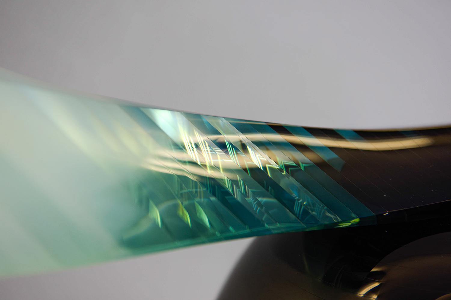 まずリズムを生み出すために3〜15mmのさまざまな厚みの板ガラスを切り出してから、一枚一枚接着とUV照射を繰り返して積層。直方体の塊から削ると重くなり廃棄量が増えるため、ある程度形に沿うよう箇所ごとに一枚の大きさを変えて切り出す。その際、隣の色のガラスを徐々に混ぜることでグラデーションになるよう並べている。