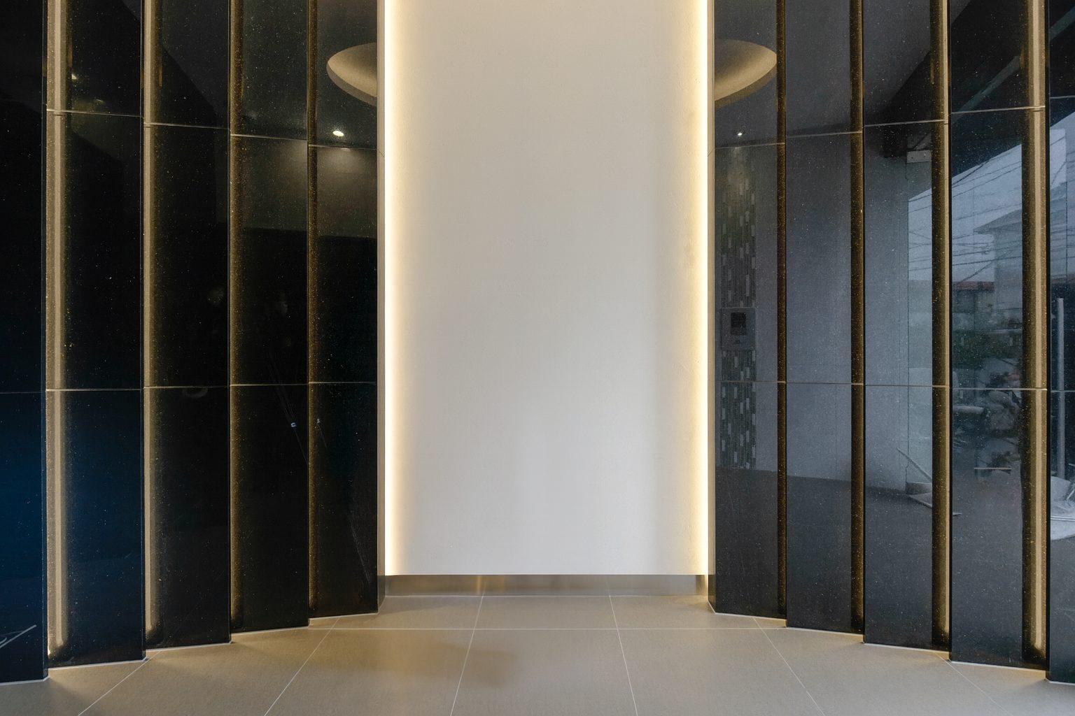 AACの最終審査会は、当該マンションに実際に作品を仮置きしてプレゼンテーションを行うのが特徴だ。今回の作品設置場所は「アジールコート都立大学」(東京都目黒区)のエントランスホール。作品の条件は、幅1500×奥行500×高さ3000mmのスペースに収まり、台座置きは約100kg以下、壁付けは約30kg以下で展示可能なものとされた。